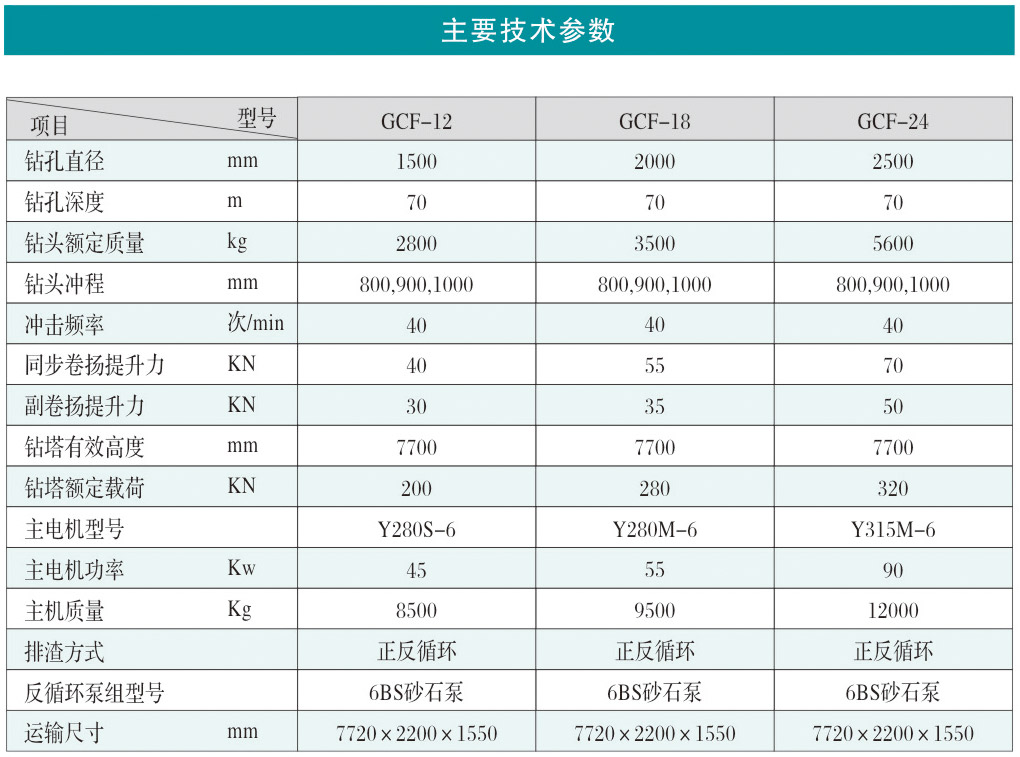 GCF型系列沖擊反循環(huán)工程鉆機為我公司研制的基礎(chǔ)工程施工設(shè)備,適用于土層,巖層,尤其適用于卵礫石、膠結(jié)卵礫石等復雜地層的基礎(chǔ)施工,廣泛應用于橋梁基礎(chǔ)、電站基礎(chǔ)、地下連續(xù)墻、水井鉆鑿等工程施工。該鉆機技術(shù)先進,性能可靠,價格適中,為同類鉆機之精品。
